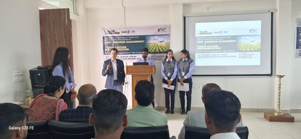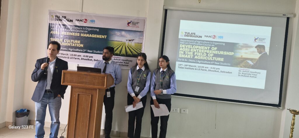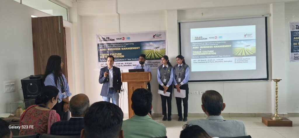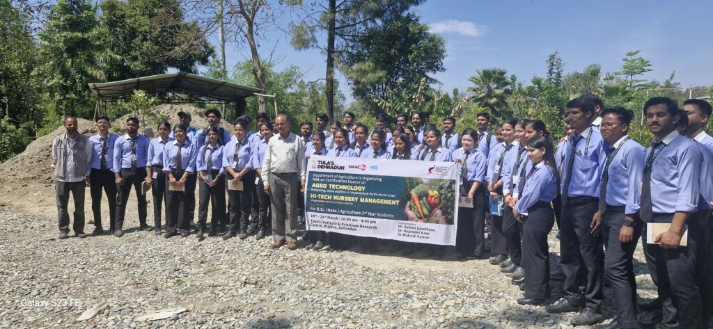 Krishivan Research Centre, in collaboration with Tula’s Institute, Dehradun, successfully conducted an Add-on Certificate Course on Agro Technology Processing & Value Addition and Hi-Tech Nursery Management for B.Sc. Agriculture students from 19th to 28th March 2026. The program was designed to bridge the gap between academic learning and practical agricultural applications, focusing on skill development and innovation in the agri-sector.